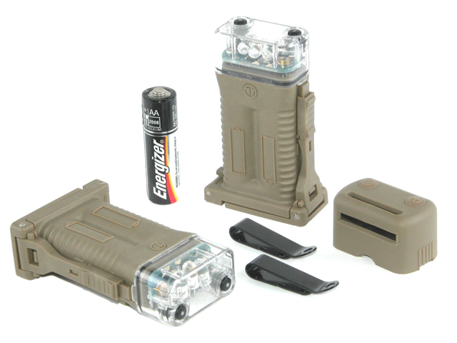 Powered by 2 common AA batteries, Velux™ 5 uses the most common power source available anywhere in the world. Velux™ 5 can be attached to PALS webbing, belts, or uniform by using the supplied locking spring clips.