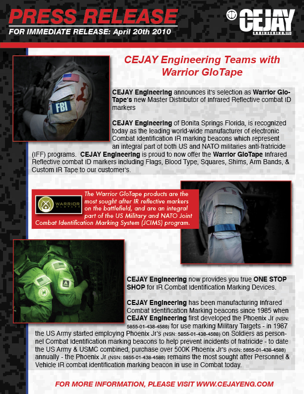 CEJAY Engineering announces it’s selection as Warrior GloTape’s new Master Distributor of Infrared Reflective combat ID markers.
